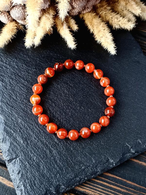 Сердолик 💎 Размер бусин - 8 мм Размер браслета 17-19 см Сердолик ассоциируется с любовью, верностью и семейным счастьем. Эзотерики советуют обзавестись украшением с самоцветом каждому, кто хочет уберечь свою личную жизнь от ссор, ревности и предательства. Камень защищает от скандалов, ссор и негативного постороннего влияния, делает своего обладателя более тактичным, учит находить компромиссы и принимать сложные решения. Сердолик защищает от зависти, придает уверенности в собственных силах, помогает развить интуицию и наполняет своего хозяина жизненной энергией, улучшает настроение, привлекает удачу и финансовый успех. Необычные свойства минерала лучше всего становятся заметны художникам, писателям, музыкантам, скульпторам, актерам, ремесленникам и бизнесменам. Людям этих профессий такой талисман подарит творческое вдохновение, поможет им в достижении успеха и материального благополучия. Сердолик рекомендуется носить людям, которые желают оставаться активными и сохранять при этом душевное спокойствие. Камень считается универсальным, поэтому носить его могут все желающие. В качестве талисмана носить его лучше всего на руке.