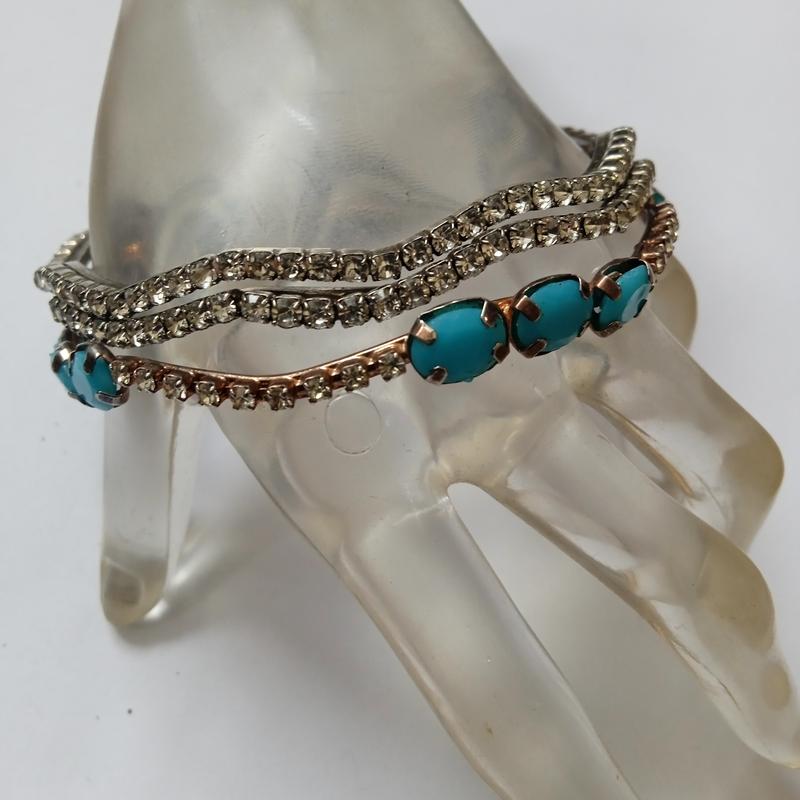 Три браслета за одну цену. На золотистом браслете пластиковые голубые вставки.