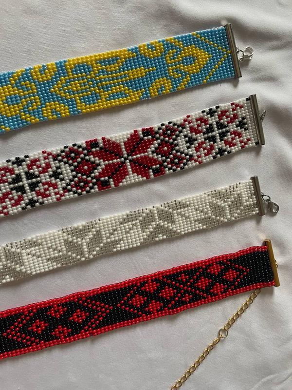 Браслет из бисера в традиционном украинском стиле. Сине-желтый и бело красный - ширина 3,5 см 300 грн Черно-прозрачный - ширина 4,5 см 350 грн Браслеты изготовлены из качественного чешского бисера Preciosa. Длина регулируется благодаря удлинителям (помимо белого )