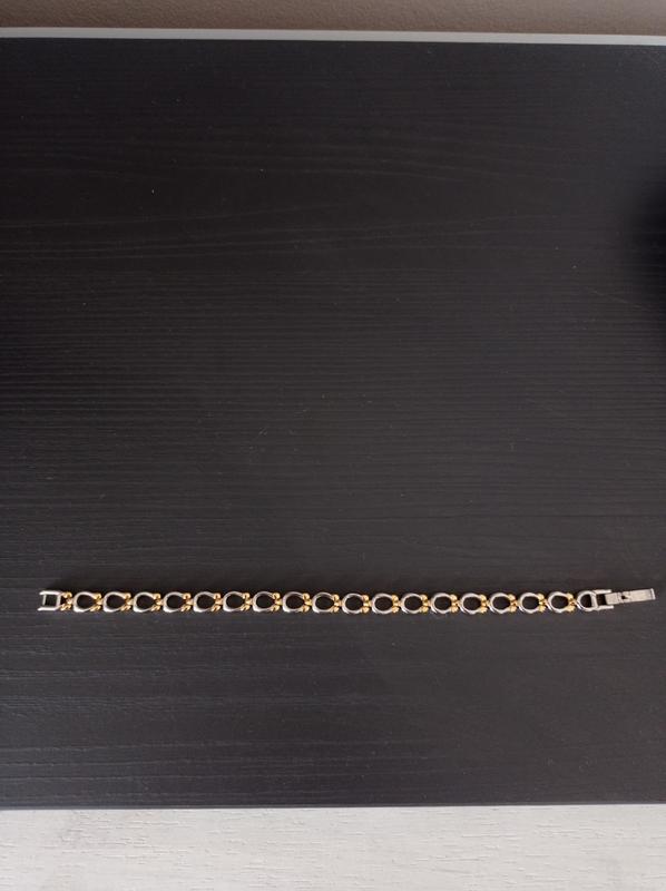 Браслет, плетіння білого та позолоченого металу. Не чорніє, виглядає красиво. Довжина 18 см