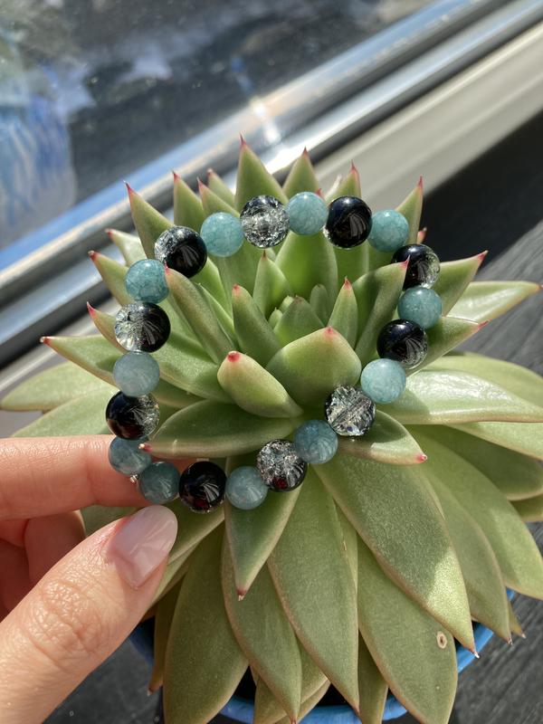 Браслет из комбинации аквамарина и стеклянных бусин краклее. На резинке.