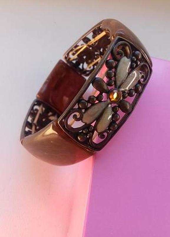 Женский браслет выполнен в необычном дизайне, который оценят смелые девушки. Главный акцент сфокусирован на декоре в виде резных витражей со стрекозами. Их крылья покрыты перламутровой эмалью, а по центру красивый матовый кристалл. Часть браслета сделана из цельных элементов. удачно сочетающихся с витражами. Украшение подходит для завершения оригинального женского образа. Браслет станет хорошим подарком к особому случаю. Элементы браслета собраны на прочных эластичных резинках.. Ширина браслета 2 см