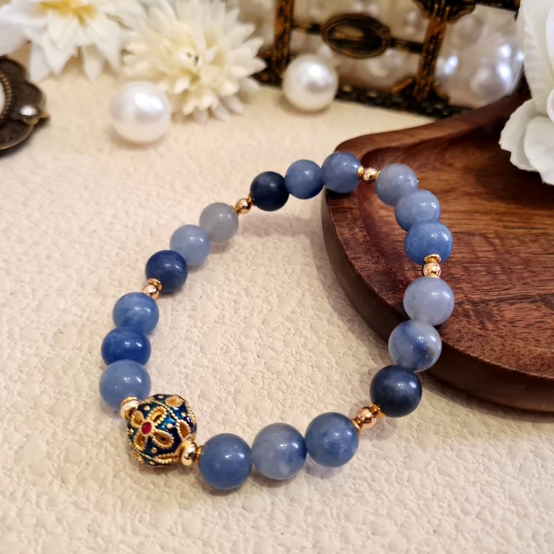 🩵🪷 Шикарный стильный браслет-резинка из натурального камня голубой авантюрин хорошего качества. Фурнитура сплав золотистого цвета с покрытием (не темнеет). В центре этого браслета акцентная бусина клуазоне – двусторонняя, с разноцветной эмалью. Диаметр 10 мм. КЛУАЗОНЕ (перегородчатая эмаль) – тип эмали при котором поверхность предмета разделена тонкими металлическими полосками на секции, заполняющимися перед обжигом порошком цветного стекла. Размер: на обхват руки до 18 см, размер бусин 8 мм, бусина клуазона 10 мм. Состав: натуральный камень голубой авантюрин.