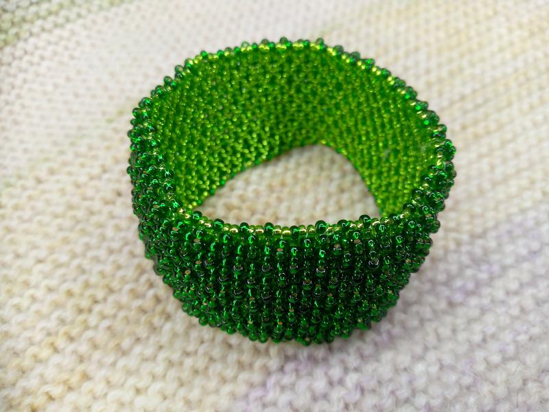 З цим браслетом ви будете виглядати дуже вишукано. Трохи розтягується завдяки особливостям плетіння. Зроблен як одне ціле з двох кольорів бісеру, а саме смарагдового та салатного металевого. Нитки: "Титан". Внутрішній диаметр 5,5 см. Вага 36 г.