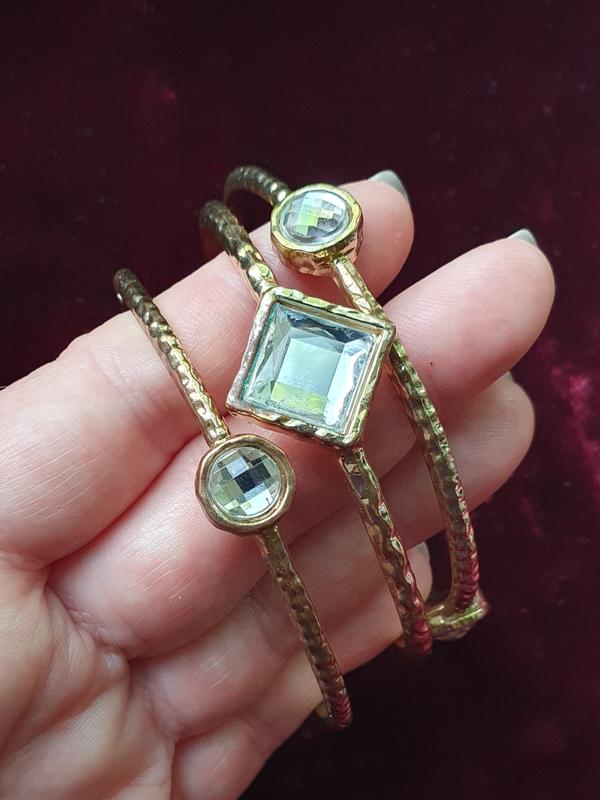 Набор из трех жестких винтажных браслетов со стеклянными зеркальными вставками. Европейский винтаж. Есть незначительные потертости с обратной стороны браслетов (смотри фото). В целом состояние очень хорошее. Диаметр 20,5 см. Замеры на фото. Все фотографии актуальны. Вы получаете товар указанный в объявлении и на фотографиях.
