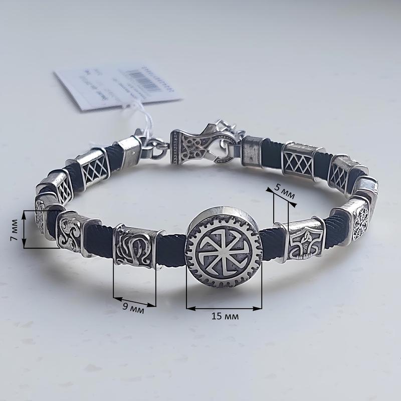 Элегантный браслет на черном шелковом шнурке, сочетающий традиции и современный стиль. Украшение состоит из 10 серебряных вставок 925 проб, которые украшены древними рунами, символизирующими мудрость, силу и гармонию. Центральная вставка выполнена в виде символа Коловрат — древнего знака солнечной энергии и цикличности жизни. Изделие имеет государственную пробу, что подтверждает высокое качество материалов. Этот браслет станет отличным подарком для тех, кто ценит духовный смысл и красоту в аксессуарах. Описание звеньев - Мировое Дерево Иггдрасиль, Валькирия, Один на Слейпнире, Валькнут, Вегвизир, Хугин и Мунин, Шлем Жаху, IIов узел, Молот Тора, Мировой змей Ёрмунганд. Характеристики Размер центральной вставки: диаметр — 15 мм, толщина — 5 мм. Размер дополнительных вставок: длина - 9 мм, высота - 7 мм, толщина - 5 мм. Размер можно регулировать за счет дополнительных звеньев +3 см. Металл: Серебро 925, лазерная проба