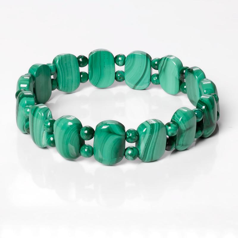 Браслет из натурального малахита. Камни - размер Ø3 - 4*8*12 мм. Браслет - размер (длина) 19 см. Малахит -- водный карбонат меди всех оттенков зеленого цвета, вплоть до черно- зеленого. В древности его считали камнем врачей и ученых, символом исполнения желаний. В Древнем Египте женщины раствором малахитовой зелени удлиняли глаза, порошком малахита наносили зеленые тени. Считается, что малахит приносит исполнение желаний, он популярен как детский амулет. Его надевают на шею ребенку для защиты от болезней и опасностей. В старину носили перстень с малахитом как оберег от холеры и чумы. Владелец чаши из малахита, который регулярно пользуются ею для питья, становится способным «понимать» язык наших меньших братьев -- животных. Народные целители считают, что малахит является прекрасным средством от болезней кожи. Браслеты из малахита очищают кожу от аллергических высыпаний и красных пятен. Бусы из малахита, по мнению знахарей, помогают значительно улучшить рост волос. Литотерапевты предполагают, что этот минерал может облегчить приступы бронхиальной астмы, лечить заболевания глаз, улучшить зрение. Считается, что пластинки из малахита, наложенные на больные места, способны вылечить ревматизм. Малахит влияют на лобную и сердечную чакру. В древности считали, что малахит связан с силами Вселенной и является их проводником на Землю. Об этом минерале ходили легенды: будто бы он может сделать человека невидимым, а если нить из малахитовой чаши, то будешь понимать язык животных. На Руси малахит считали камнем, исполняющим желания. Малахит -- камень мая. В этот период он наиболее силен. Говорят, что, если в мае носить талисман из малахита, можно избавиться от беспричинных страхов, меланхолии, бессонницы. Минерал темно-зеленого цвета поддерживает и усиливает духовные силы своего владельца. Он гармонизирует его внутренний мир и мир вокруг человека. Талисманы и амулеты: в качестве талисмана малахит следует использовать тем, кто хочет усилить свое обаяние и привлекательность. Музыкантам, литераторам, художникам камень помогает, если оправлен в медь. Более всего необходим самоцвет артистам, но для них малахит нужно оправлять в белые металлы: серебро, платину, алюминий.