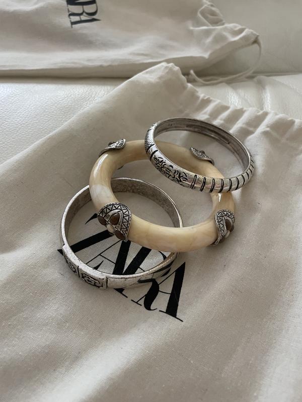 Нові круті браслети для образу. Комплект браслетів в етнічному стилі Стильні браслети з елементами різьблення і текстури у вінтажному та етнічному стилі. У наборі: - Широкий металевий браслет з тонким гравірованим орнаментом. - Браслет з імітацією кістки і різьбленим металевим обідком зі вставками. - Металевий браслет з рельєфною спіральною текстурою. Відмінно поєднуються між собою і доповнюють як повсякденні, так і бохо-образи. Універсальний розмір.