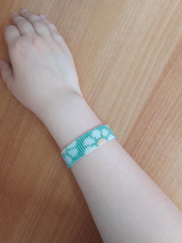 Красивый летний браслет из чешского бисера ручной работы с ромашковым принтом. Фурнитура из нержавеющей стали. Размер: длина: 15,5см без застежки и 22,5см с застежкой; ширина - 1,9см.