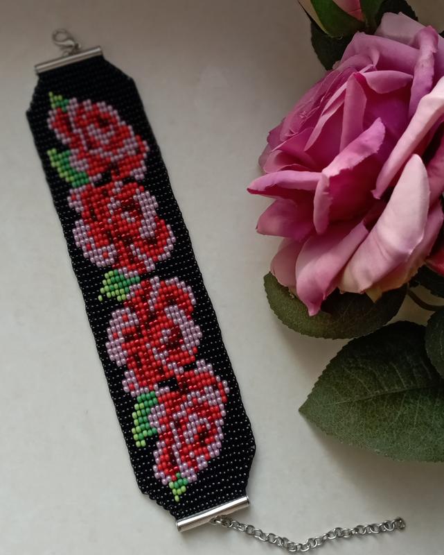 Браслет из бисера цветы, длина регулируется с помощью цепочки.