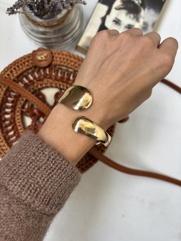 В наявності -560📮 Довжина браслета становить 20 см, і її можна зменшити. Браслет має широку, гладку форму з розрізом, що надає йому сучасний, мінімалістичний вигляд. Виріб виконаний у золотому кольорі з глянцевим блиском.
