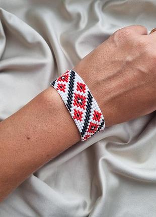 Тканый браслет из бисера с традиционным узором. Изготовлен из качественных материалов: 🔸️чешского бисера; 🔸️застежка из нержавеющей стали. Длина с застежкой - 18 см + 5 см цепочка удлинитель Ширина - 2,4 см