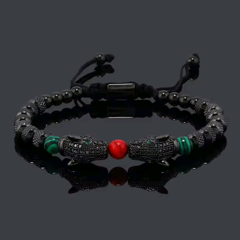 Стильный браслет для модниц с Пантерами на затяжке. Сделано из металлических бусин на шнурке. Подойдет на руку 16-17-18 см