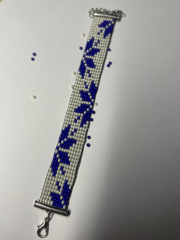 Вишуканий браслет ручної роботи, створений у техніці ткацького бісероплетіння. Поєднання глибокого синього кольору з ніжним перламутровим тлом створює елегантний та водночас сучасний образ. Орнамент натхненний традиційними українськими візерунками, що символізують гармонію, чистоту й натхнення. 🔹 Матеріали: чеський бісер Preciosa, металева фурнітура, надійна застібка-карабін. 🔹 Ширина: приблизно 2 см 🔹 Довжина: 15–17 см (регулюється за допомогою ланцюжка) 🔹 Колір: перламутровий і синій 🔹 Стиль: український етнічний / сучасна вишиванка 🔹 Тип застібки: карабін 🔹 Ручна робота: так, кожен браслет унікальний