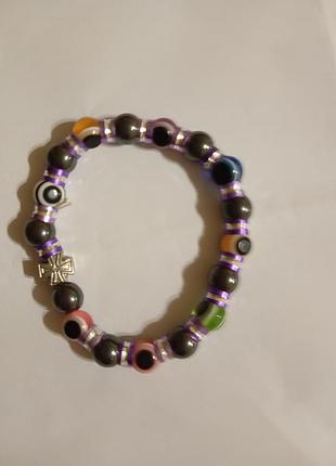 браслет на резинке размер 18 камушины разных видов есть и крестик и кшаче глаз