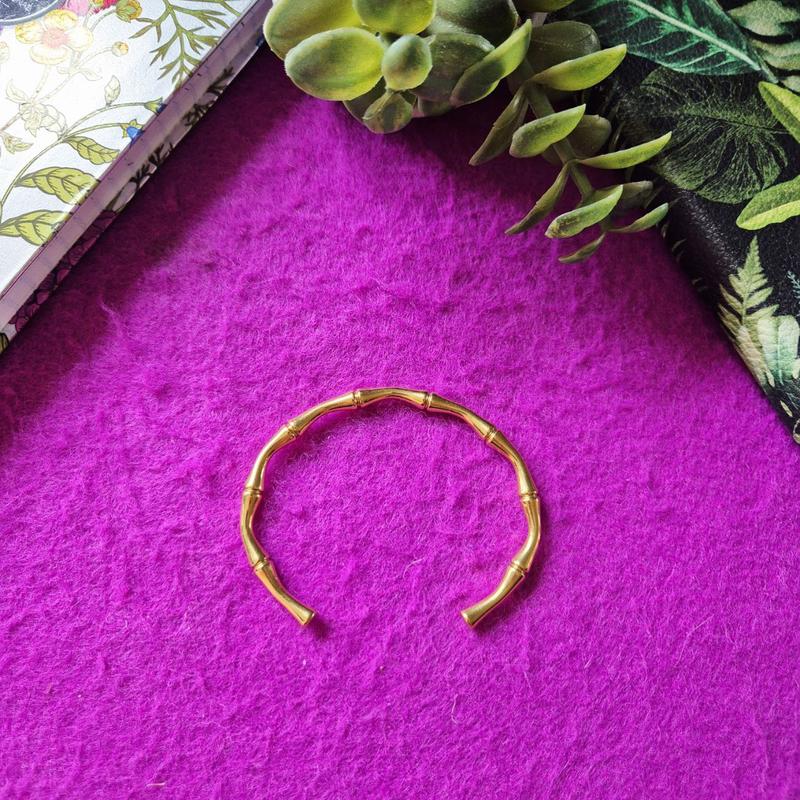 Очень стильная вещь, +\- современная. Стальной браслет золотистого цвета. Форма - полу обод. Жесткая конструкция. Стиль - бамбукова стеблина. Качественное исполнение. Макрирование отойдет. Состояние красивое. Подойдет на запястье 16-17 см. Длина - 15 см. Добавлен видеообхват.