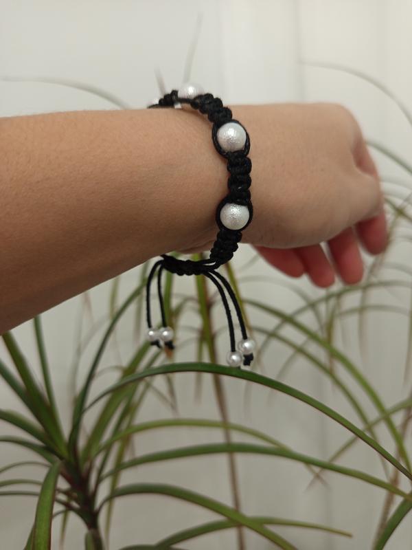 Браслет ручной работы, выполненный из черного воскаленного шнура с бусинками, размер регулируется затяжкой.