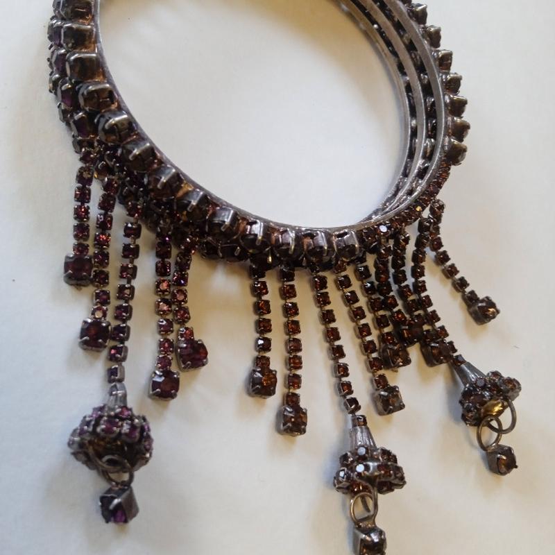 Комплект из 3-х браслетов. На среднюю руку. Камни закреплены очень хорошо. Цвет винный . Кристаллы обработаны вручную. Клейма нет. Шикарная работа.