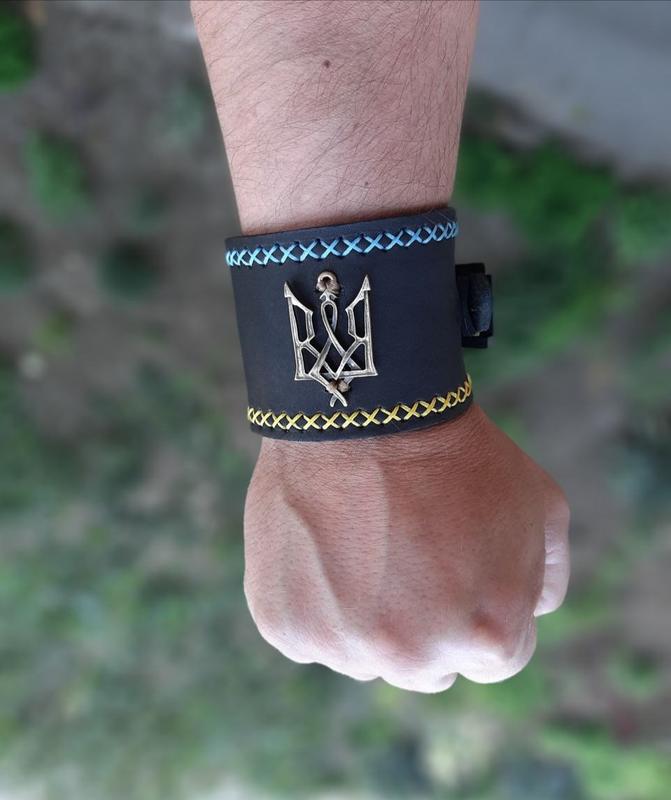 Браслет из натуральной кожи. Прошитый вручную вощеной нитью. Имеет металлическое украшение. Застегивается на пряжку. Длина - 20см, ширина - 6см, толщина - 4мм.