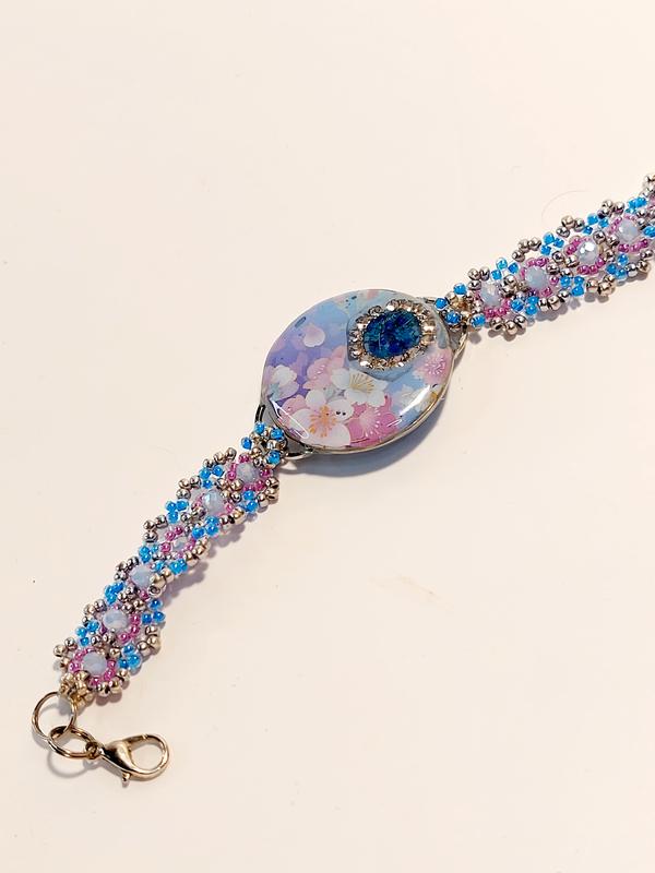 Браслет ручной работы из ювелирной смолы и бисера. Длина 16+5 см, ширина 1,5 см, диаметр центральной части 3 см, застежка карабинчик.