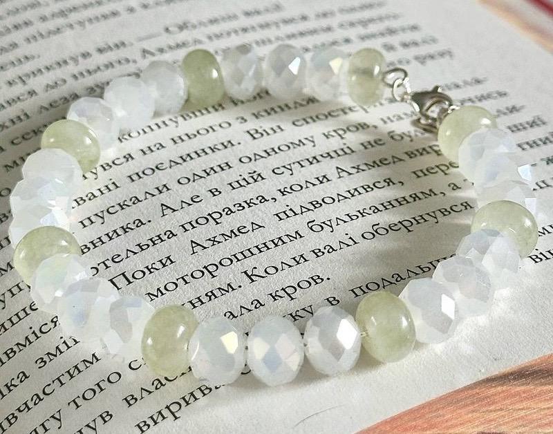 Браслет із природного нефриту та блискучого кришталя.Нефрит вважається каменем довголіття і гармонії,а кришталь посилює його чистоту.