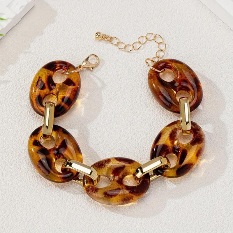 Браслет женский Стильный браслет эффектной цепочки Современный акцентный леопардовый принт акриловая прозрачная структура Чередование леопардовых и золотых вставок фурнитура золотого цвета круг браслета 19см размер звена 2х3 см