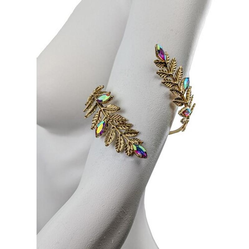 Этот изысканный браслет для предплечья предназначен для тех, кто любит оригинальные аксессуары с характером. Украшение выполнено в виде гибкой веточки, инкрустированной камнями, которая обвивает руку и идеально ложится на предплечье или выше локтя. Декоративные листья золотистого цвета создают эффект естественной утонченности с нотками греческого или богемного стиля. Размер универсальный.