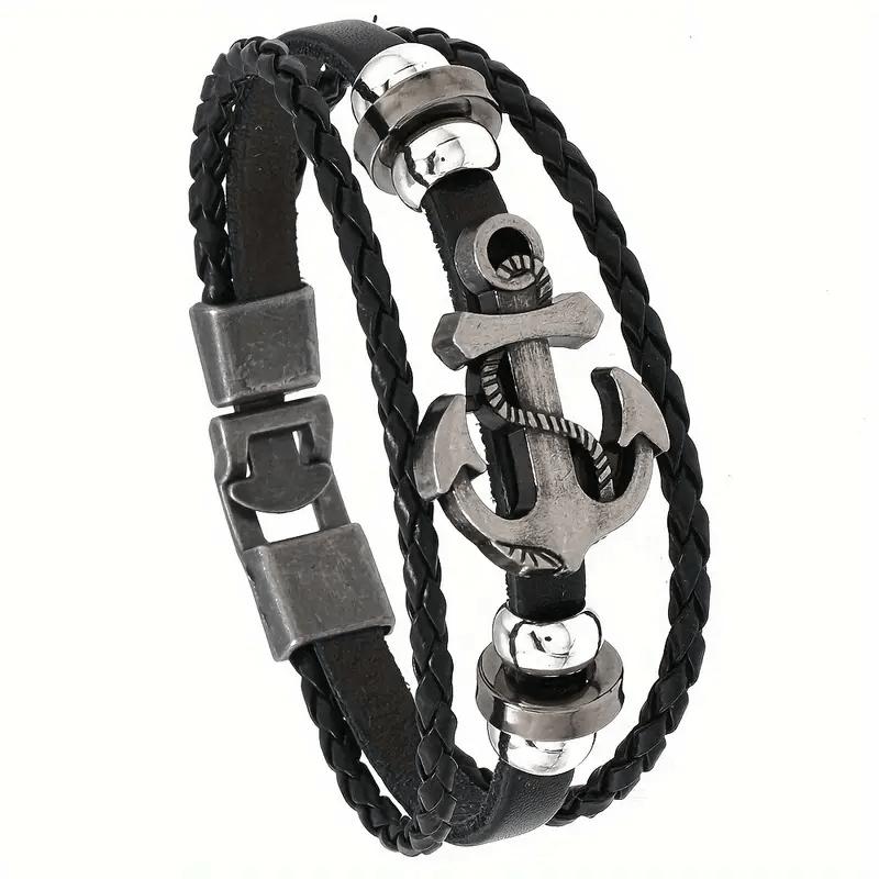 Браслет чёрный с якорем 3 в 1 на морскую вечеринку. металл, кожа. регулир р-р