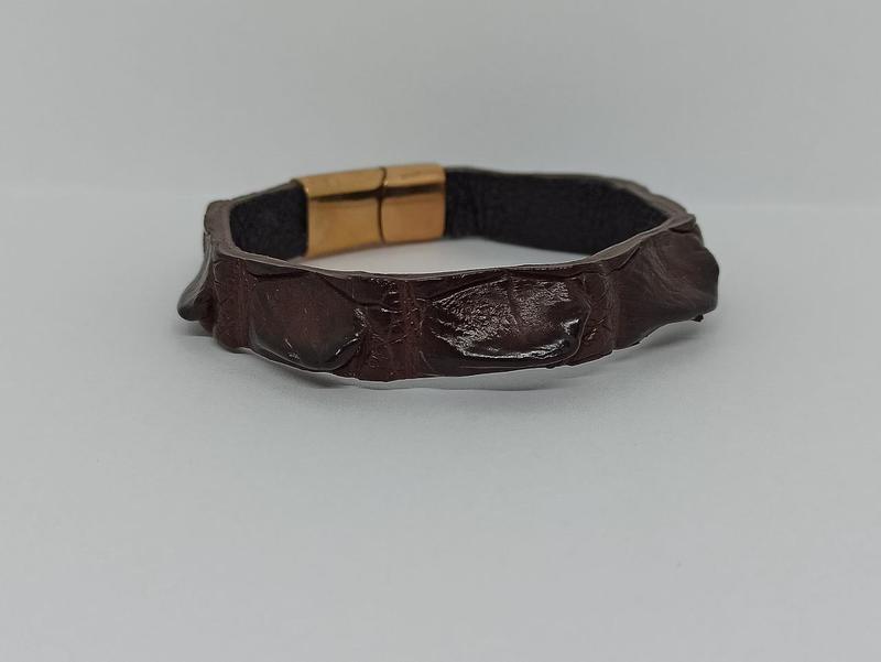 Браслет із натуральної крокодилової шкіри з золотою застібкою Елегантний браслет із натуральної крокодилової шкіри -- це втілення розкоші, статусу та бездоганного смаку. Кожен виріб має унікальну текстуру, адже природний візерунок шкіри крокодила не повторюється, що робить браслет по- справжньому ексклюзивним. Міцна та зносостійка шкіра забезпечує комфортне носіння і довговічність, а колір золотої застібки додає виробу вишуканості та надійно фіксує браслет на зап'ясті. Такий аксесуар ідеально доповнить як діловий образ, так і вечірній стиль. Переваги: - 100% натуральна крокодилова шкіра - Унікальний природний малюнок - Витончена золота застібка - Ручна робота та преміальна якість - Чудовий варіант подарунка Браслет із крокодилової шкіри -- це аксесуар, який підкреслює індивідуальність і високий статус свого власника.