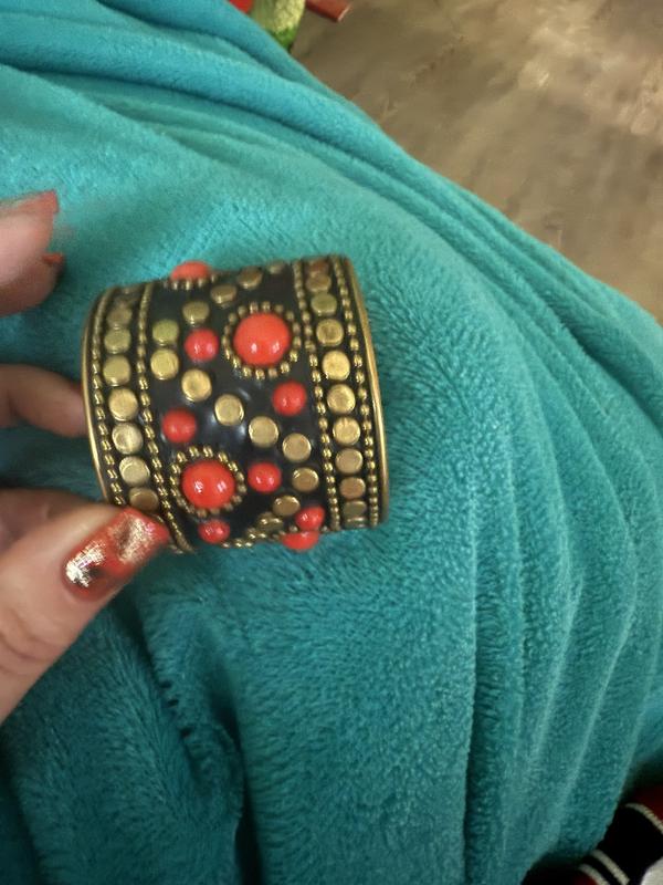 вінтажний латунний браслет-манжет з червоно-помаранчевими емалевими вкрапленнями.