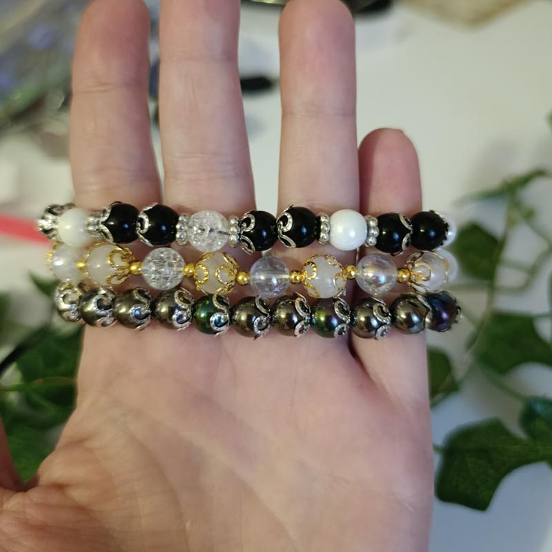 Три брата в черном, белом и перламутровом цветах, которые носятся вместе. Очень интересно и эффективно смотрится. Такое украшение будет только у вас. Эксклюзивная ручная работа. Браслет на резинке, удобно и быстро одевают и снимают.