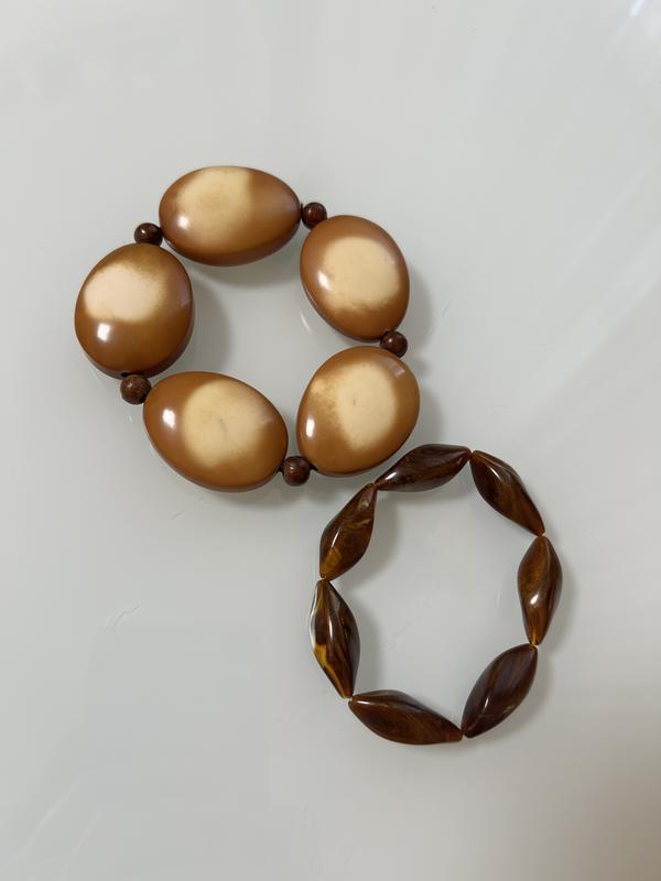 Код: 1273 Набір браслетів на резинці (2 шт.) Стильні браслети у теплих карамельно-коричневих відтінках. • Один браслет — з великими овальними намистинами з плавним переходом кольору • Другий — з подовженими намистинами з ефектним природним візерунком • Акуратна еластична резинка — зручно одягаються • Легкі, приємні до руки • Добре виглядають як разом, так і окремо • Підійдуть до повсякденних та бохо-образів Стан: дуже хороший / відмінний Ціна за набір: 350 грн