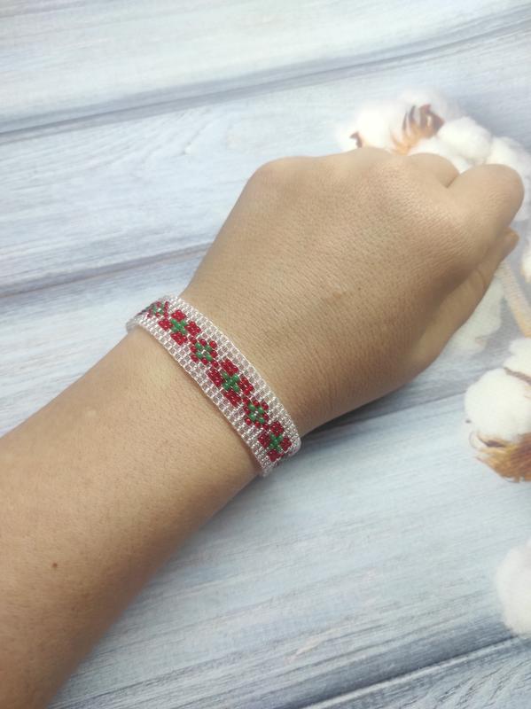 довжина 15см+ застбка з ланцюжком, ширина 1.2см, виготовлено з чешського бісеру.