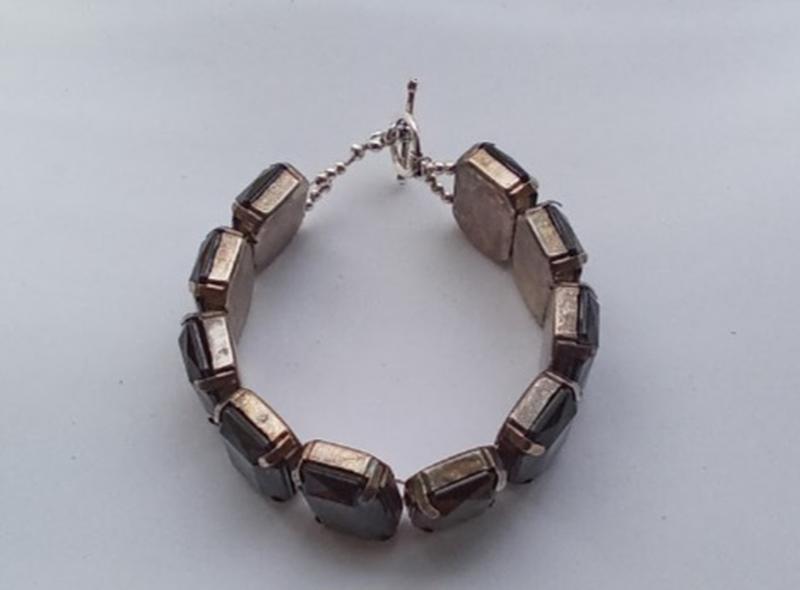 Браслет женский со стразами. Украшение выполнено из ювелирного сплава серебряного цвета, вставки пластиковые стразы черного цвета. Замок тогл.