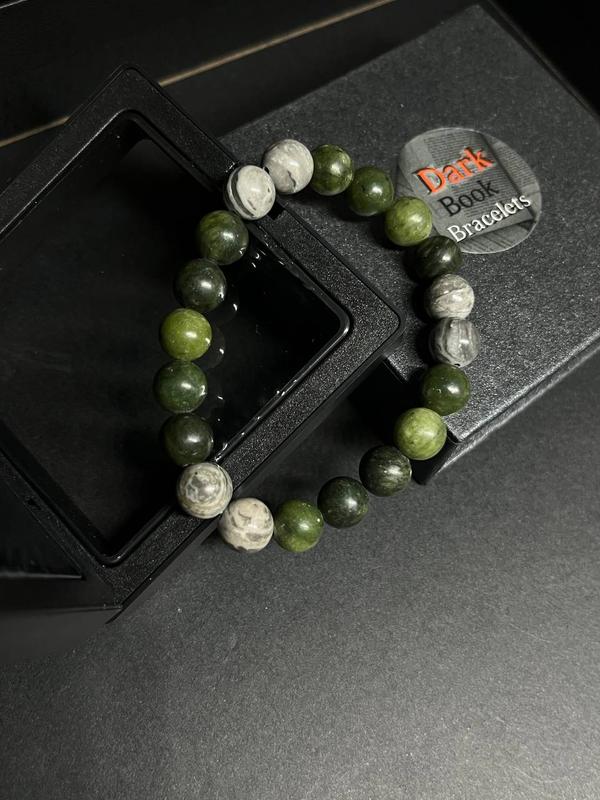 Браслет «Secret key» Цена : 400 грн🔥 Материал: натуральный камень Темно-зеленый камень выглядит так, будто видел больше, чем рассказывает. Серые камушки океанической яшмы – словно фрагменты старых страниц, слегка потертых, но настоящих. Ничего случайного, ничего презентабельного.