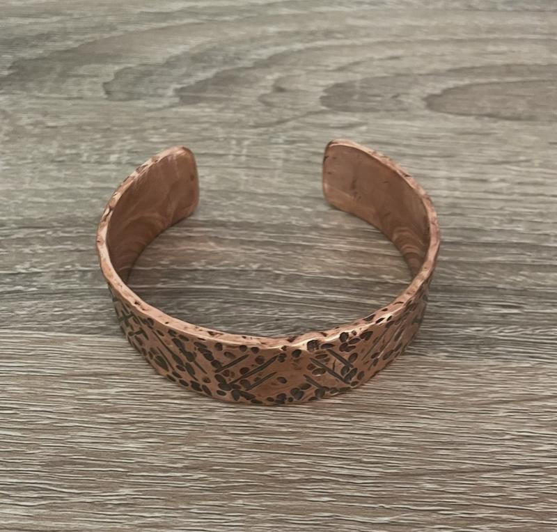 Браслет мідний, кований, запатинований, відшліфований. Розмір браслету регулюється, підійде на обхват запʼястя від 18 до 20 см. Довжина браслету-18 см. Під замовлення зроблю любий розмір.