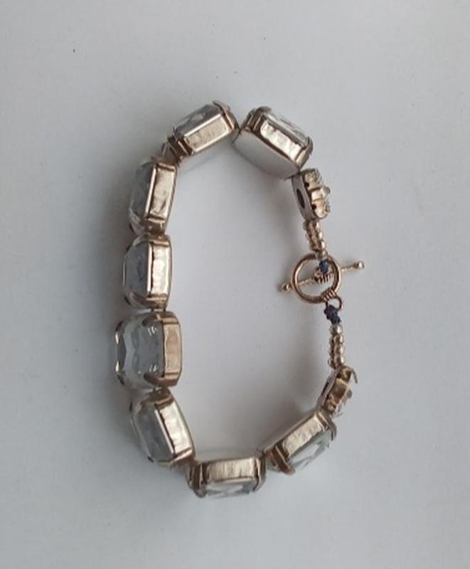 Браслет женский со стразами. Украшение выполнено из ювелирного сплава серебряного цвета. Вставки пластиковые прозрачные кристаллы. Замок тогл.