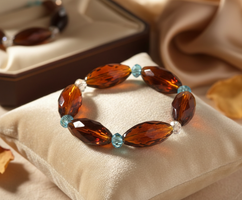 Винтажная эстетика в каждой детали.✨️Добавьте своему образу глубины и благородства с этим уникальным браслетом, созданным для тех, кто ценит вещи с историей.✨️ Настоящее винтажное стекло✨️ Центральные бусины имеют насыщенный коньячный оттенок и элегантную форму «маркиз». Это материал, который с годами не теряет своего блеска, а лишь приобретает особый характер.✨️ Изысканная игра света✨️ Гранированные вставки небесно-голубого цвета создают идеальный контраст, напоминающий пробики чистого неба сквозь теплый янтарь.✨️ Ручная работа✨️Каждая деталь подобрана таким образом, чтобы создать гармоничный аксессуар, который выглядит как драгоценная находка из антикварной лавки.✨️ Данный аксессуар идеально дополнит: Деловой стиль: придаст мягкости классическому жакету.✨️ Вечерний образ: станет изящным акцентом к платью в теплых тонах.✨️ Повседневный кэжуал: отлично смотрится с бежевым трикотажем или белой рубашкой.✨️ Винтаж — это не просто мода, это связь времен на вашем запястье.✨️