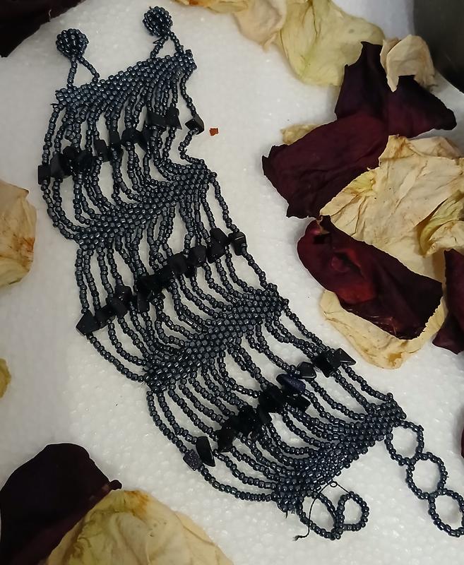 Красивый браслет из бисера,цвет серый,ртутный,с черными камушками,красивый цвет.