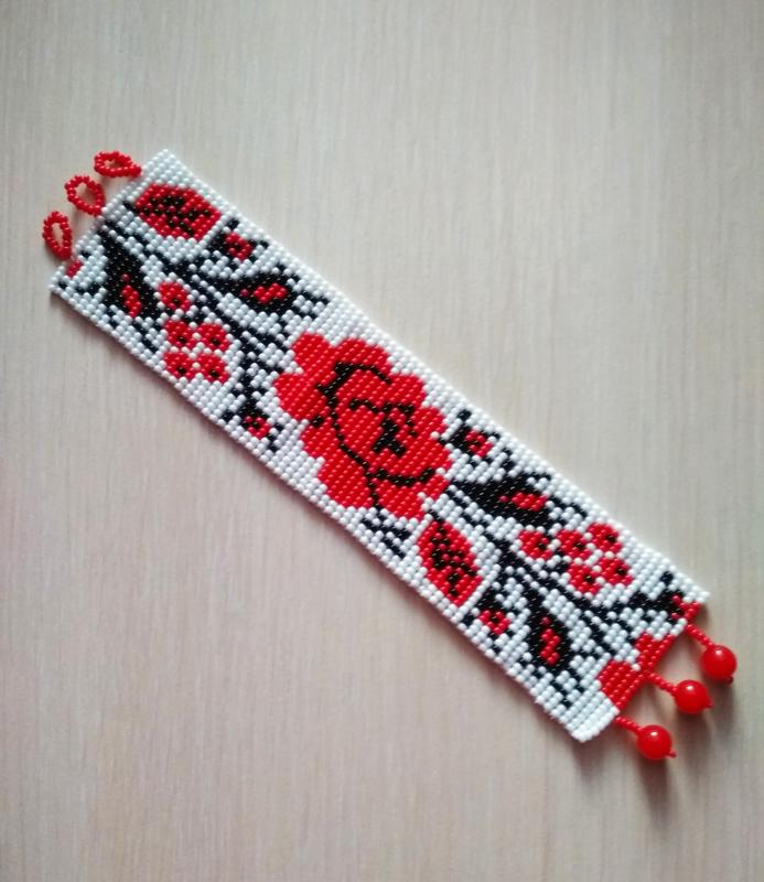 Эффектный браслет с этническим орнаментом удачно дополнит Ваш наряд. Ручная работа. Изготовлен из чешского бисера. Длина браслета - 17 см. Ширина - 4,5 см. 3 застежки-петли.