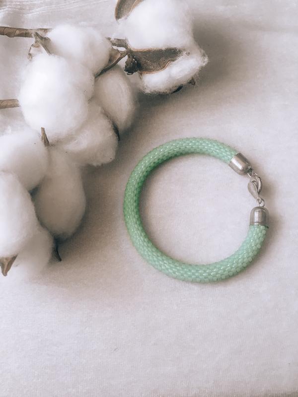 Мятный вязаный браслет из японского бисера. Удобная застёжка-кнопочка
