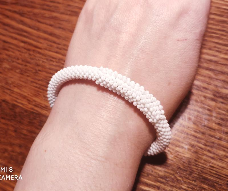 Белый браслет ручной работы вязаный крючком из чешского бисера с утолщением по центру. Можно носить отдельно или с другими браслетами. Длина 20 см.