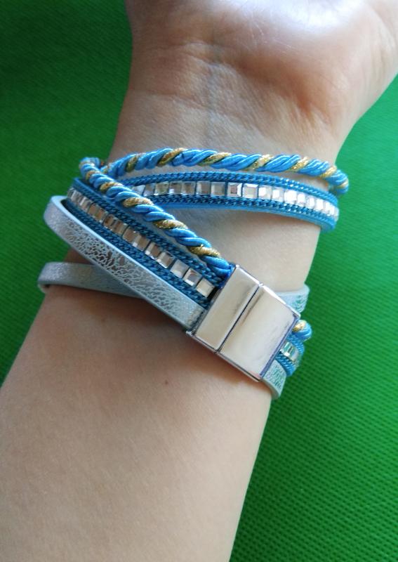 Двойной браслет на магнитной застежке. Очень хороший цвет – ближе к бирюзе. Застежка магнитная – держится хорошо. Обматывается вокруг руки 2 раза. Длина – 39 см. Материал заменитель кожи. Новый в упаковке – не носила. Отвечу на все вопросы.