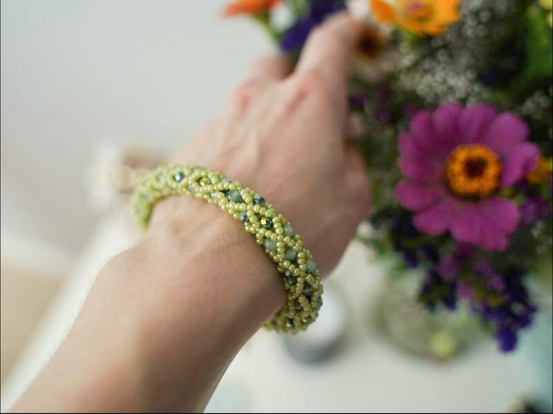 Браслет из чешского бисера и хрустальных кристаллов. Длина 19 см, можно немного регулировать за счет застежки. Ручная работа.