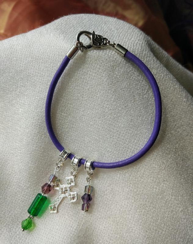 Основа браслету - натуральна шкіра бузкового кольору. На основу нанизані підвіски - різні комбінації намистин і кристалів і хрестик. Металева фурнітура під колір срібла. Розмір браслету - 20 см. Браслет зібраний в єдиному екземплярі. Передоплата на карту Приватбанку. Доставка Новою поштою або Укрпоштою за рахунок покупця.