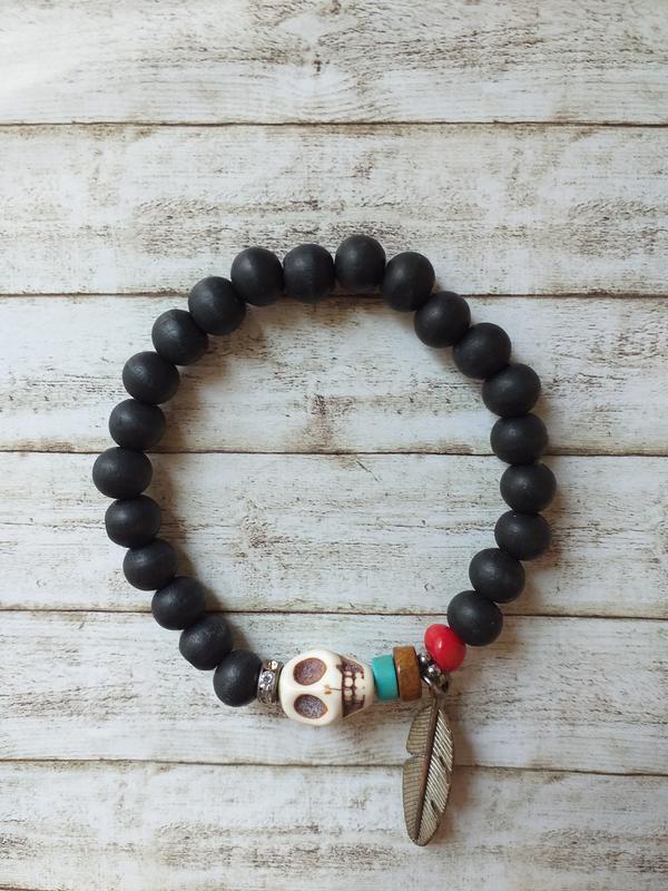 Продам стильный браслет из деревянных бусин украшенный черепом и подвеской в виде листа. Ручная работа. Практически не носился. Состояние идеальное. Размер универсальный, на резинке. Отправка н.п или укр.почтой после оплаты на карту. Самовывоза, возврата и наложеного нет.