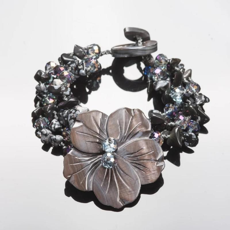 Браслет снежный обсидиан, резной перламутр, L-21см