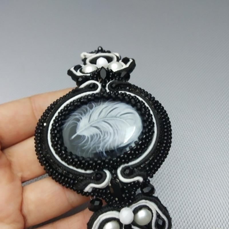 Браслет Перо Браслет с росписью на натуральном камне агате, в технике лаковой миниатюры. Это сложный , трудоемкий и длительный процесс многослойной живописи. Браслет с бусинами натурального перламутра, хрустальных бусин, чешского и японского бисера, стразовая цепочка и стразы. Посеребрение, застежка " крючок" Обратная сторона натуральная кожа черного цвета. Браслет 19 см