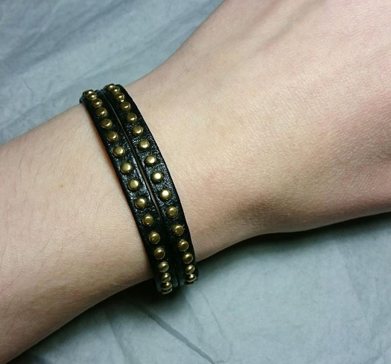 Стильный браслет из натуральной кожи с заклёпками из жёлтого металла. Ручная работа. Был приобретён за $20. Надевался максимум два раза. Длина: 15,5 см, имеется небольшая цепочка-удлинитель. Ширина: 1,2 см. Цвет кожи: чёрный. С внутренней стороны по краям браслета металл немного обтёрся. Больше украшений смотрите в моих объявлениях.
