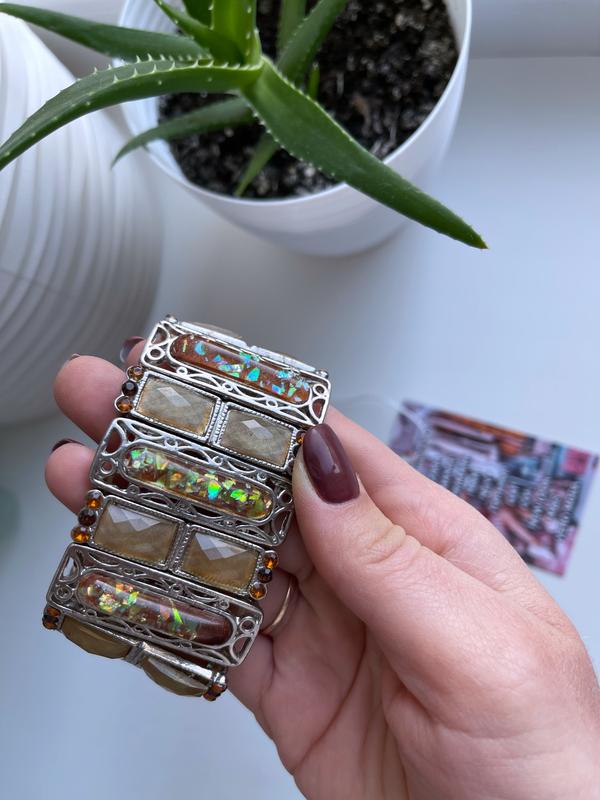 Массивный браслет из метала и камушков. Очень красивая вещь, дополнит образ и добавит акцента. На резинке, по этому подойдёт на любой объём руки. Состояние идеальное, каждый камушек на своём месте.